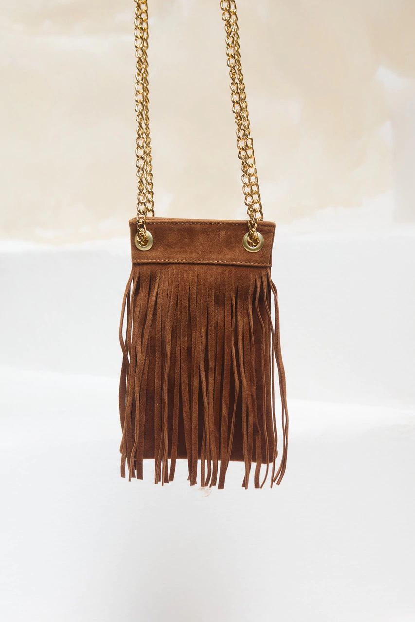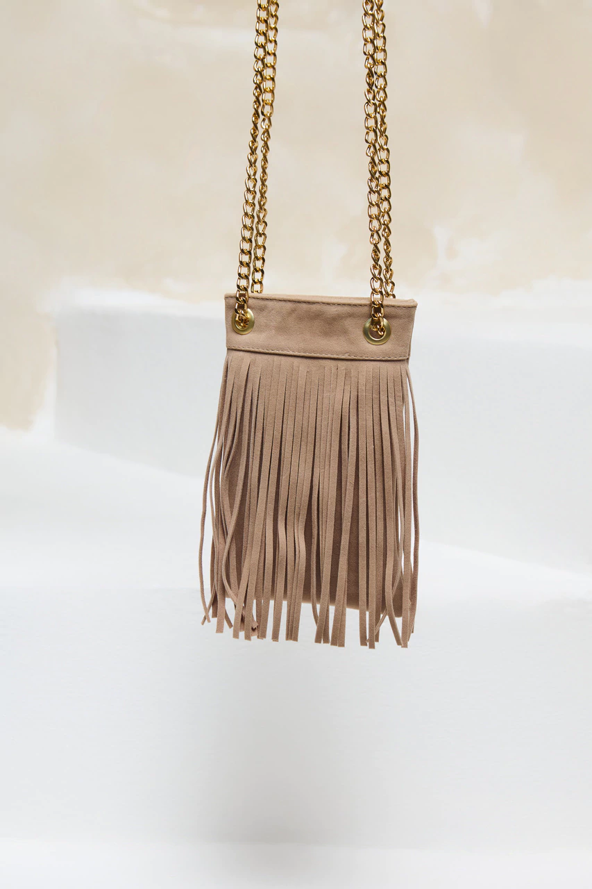 Bag comprida com detalhe em franja, alça em corrente, material sintético e textura nobuck. Sem feicho.